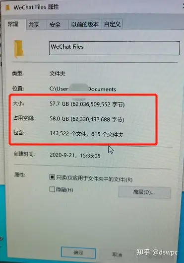 打开属性窗口,在属性中会有一些数值在动,因为数据较多系统需要计算,等待数字不动了就是你微信占用电脑C盘的全部空间数量。下图是我占用的有58GB,而且微信的聊天记录是不停在增加的,只要电脑登录微信他就会增长,对于C盘来说这种不断扩大的文件是无法承受,终究有一天会把C盘占满了。