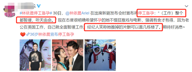 据悉,林依晨拍完《小女花不弃》之后,就宣布暂时息影,专心备孕。