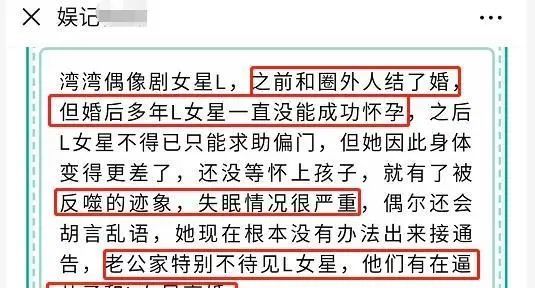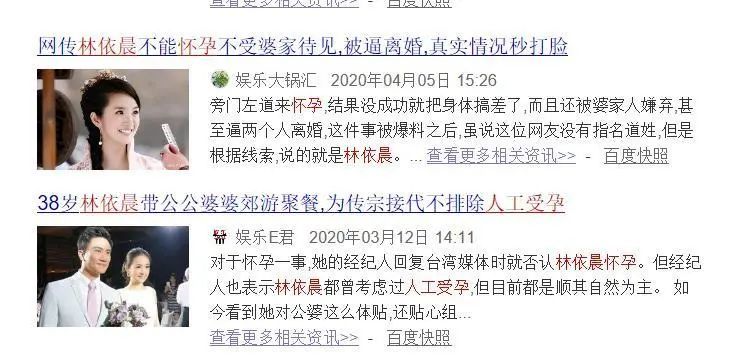 前不久还有营销号爆料,L女星因多年未孕,急着尝试了很多偏方怀孕,而且婆家也不很待见她。很多网友们从爆料中猜测这个L姓女星应该就是林依晨。
