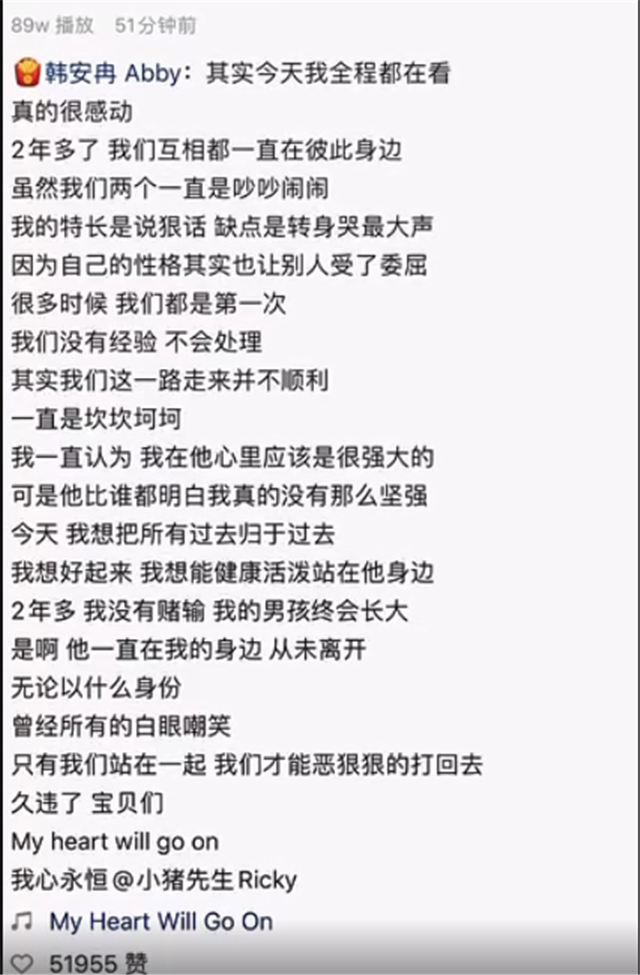 韩安冉随后也发文复合,说了一大段的文字,她说直播她一直在旁边看着,也哭了,她很感动,许多事情他们都是第一次处理,现在他们要复合再次在一起了,还说我的男孩长大了,想把过去归于过去。看来两个人是真的要复合了,还说得非常真情实感。许多网友吐槽说,怀疑他们根本没有离婚过。