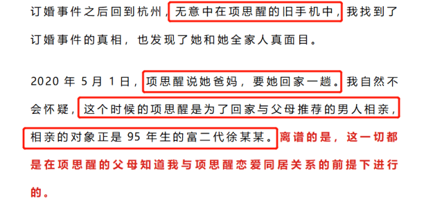 然而项思醒成名之后却并不满足,她的家人也非常有“上进心”,明知道女儿有男友,却依然张罗着帮女儿找相亲对象。最后真的钓到“金龟婿”徐某某。据张科峰表示,徐某某父亲是地产商,家中数亿资产,比起张科峰这种白手起家辛苦创业的,活得更加轻松。