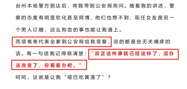 张科峰当然不会坐视两人订婚,他带着朋友们紧急赶往订婚现场,同时要求项思醒爸爸停止订婚,并给自己一个解释。但项思醒爸爸直接挂断电话。而张科峰抵达现场后,大闹一番,项思醒和徐某某家人报警,张科峰随后被抓走。警察在听完事情始末后,也被震惊了,项思醒爸爸前来处理,告诉张科峰“反正这件事已经这样了,没办法改变了,你看着办吧”,让张科峰再次无语。好在张科峰并没有被为难,当天就出来了,并直接返回家中。