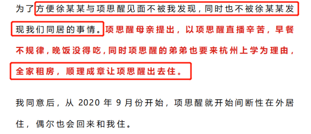 此后的事情,更让张科峰惊讶,原来他早就和徐某某见过面,而且项思醒父母、弟弟等全家人都帮忙打掩护,为的就是能让项思醒和徐某某,在张科峰跟前不知不觉地秀恩爱。项思醒原本和张科峰同居,后来以弟弟上学,全家租房照顾为由搬了出去。另一方面,她对富二代徐某某表示,自己和其他女生合租。